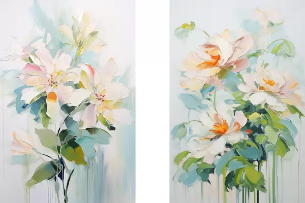 Poster Flores blancas y pastel melocotón, hojas verdes, pinceladas suaves imitación pintura al óleo, fondo azul claro Nr d00644
