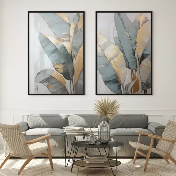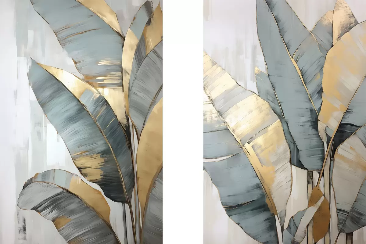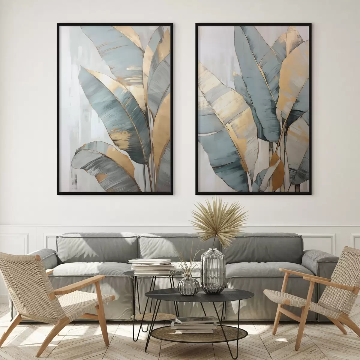 Poster Conjunto de hojas de plátano azules, grises y amarillas con pinceladas visibles, sobre un fondo blanco abstracto Nr d00645