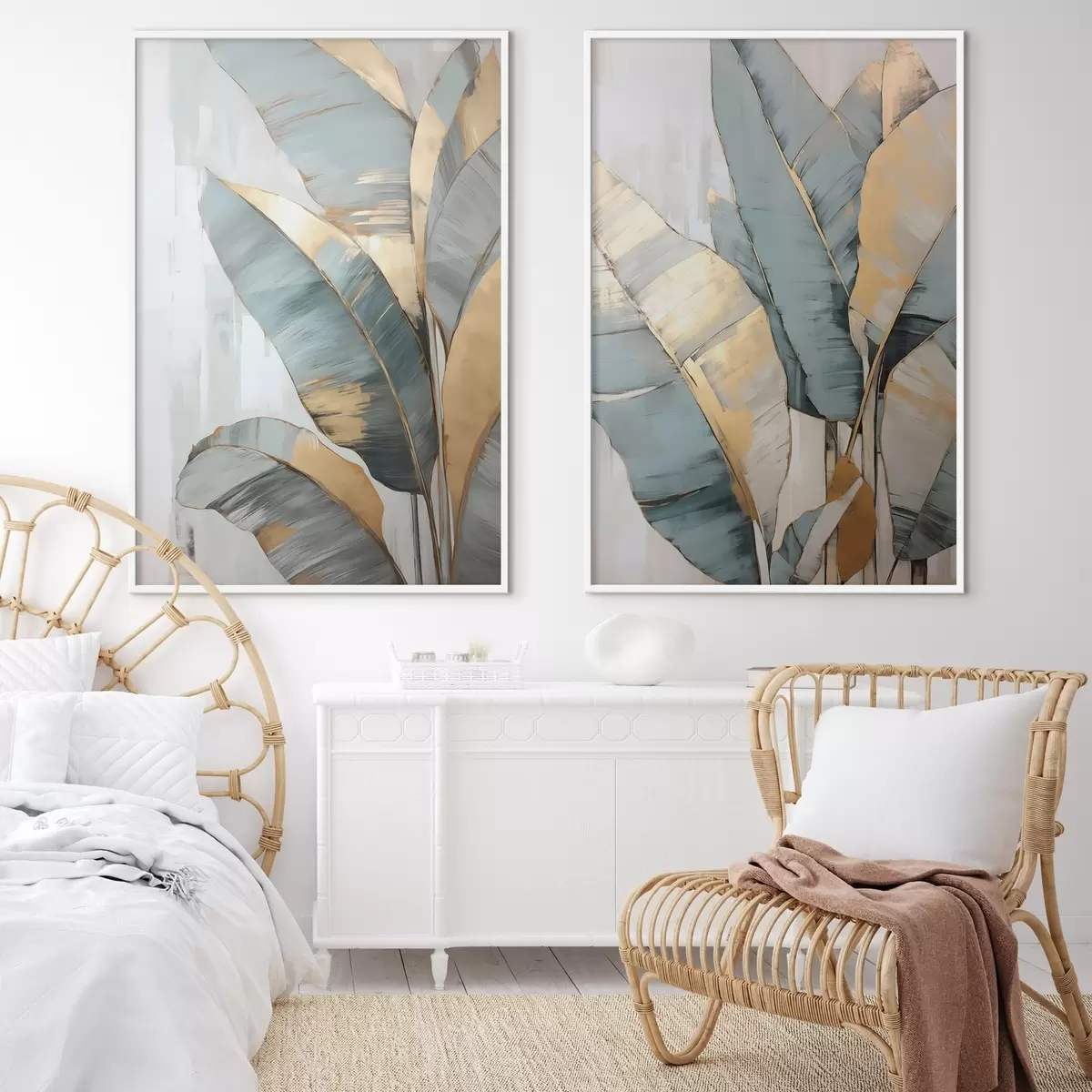 Poster Conjunto de hojas de plátano azules, grises y amarillas con pinceladas visibles, sobre un fondo blanco abstracto d00645