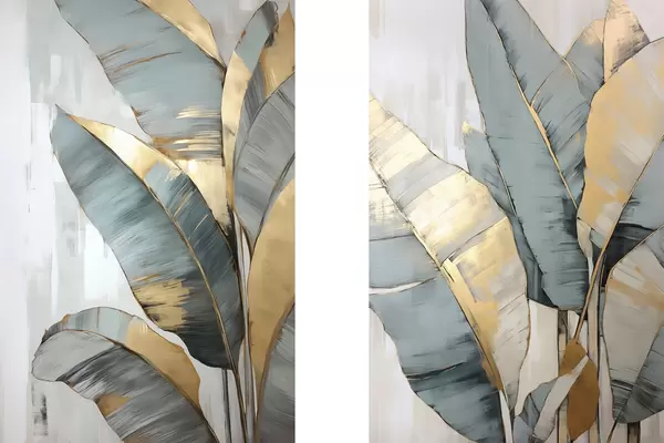 Poster Conjunto de hojas de plátano azules, grises y amarillas con pinceladas visibles, sobre un fondo blanco abstracto Nr d00645