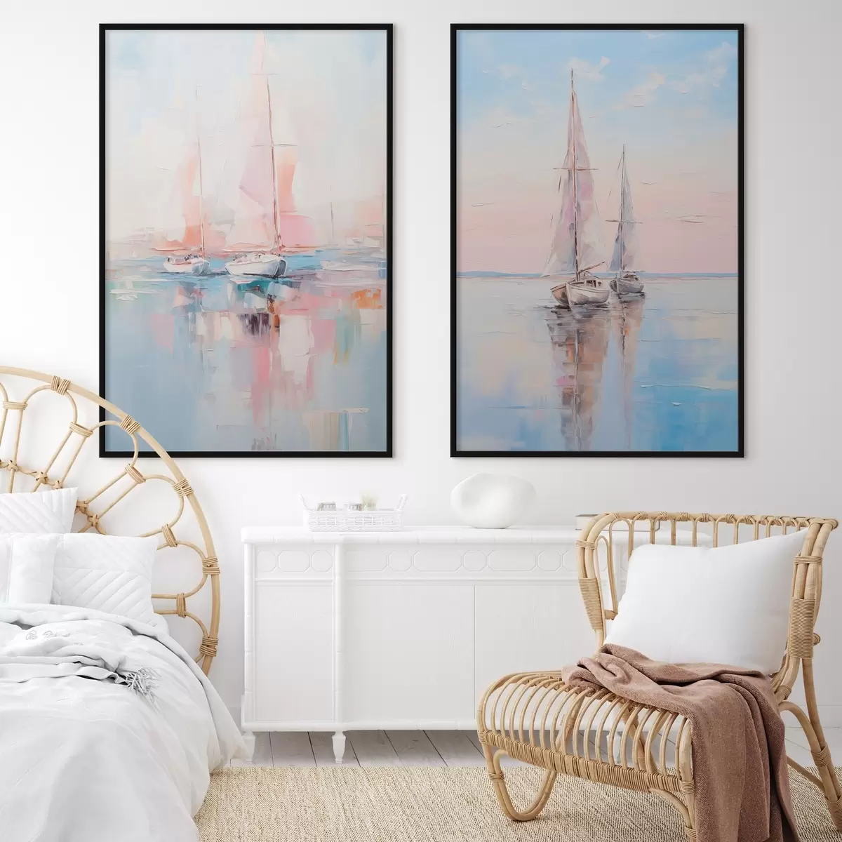Poster Veleros con velas rosas flotando en un mar en calma, reflejos de los barcos en el agua, suaves colores pastel Nr d00648
