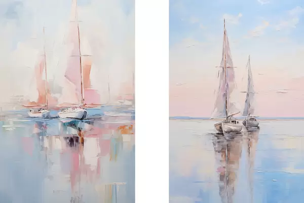 Poster Veleros con velas rosas flotando en un mar en calma, reflejos de los barcos en el agua, suaves colores pastel Nr d00648
