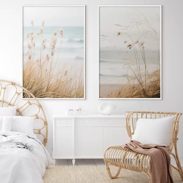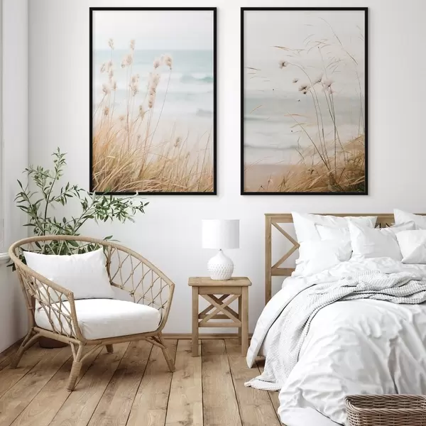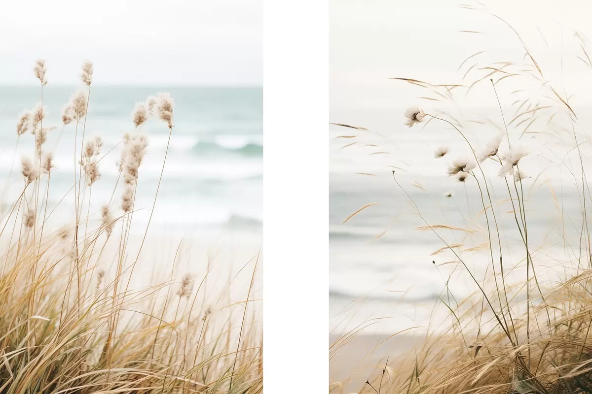 Poster Hierba alta con esponjosas cabezas de semillas, playa de arena y olas del océano al fondo, paleta de colores suaves y apagados Nr d00650