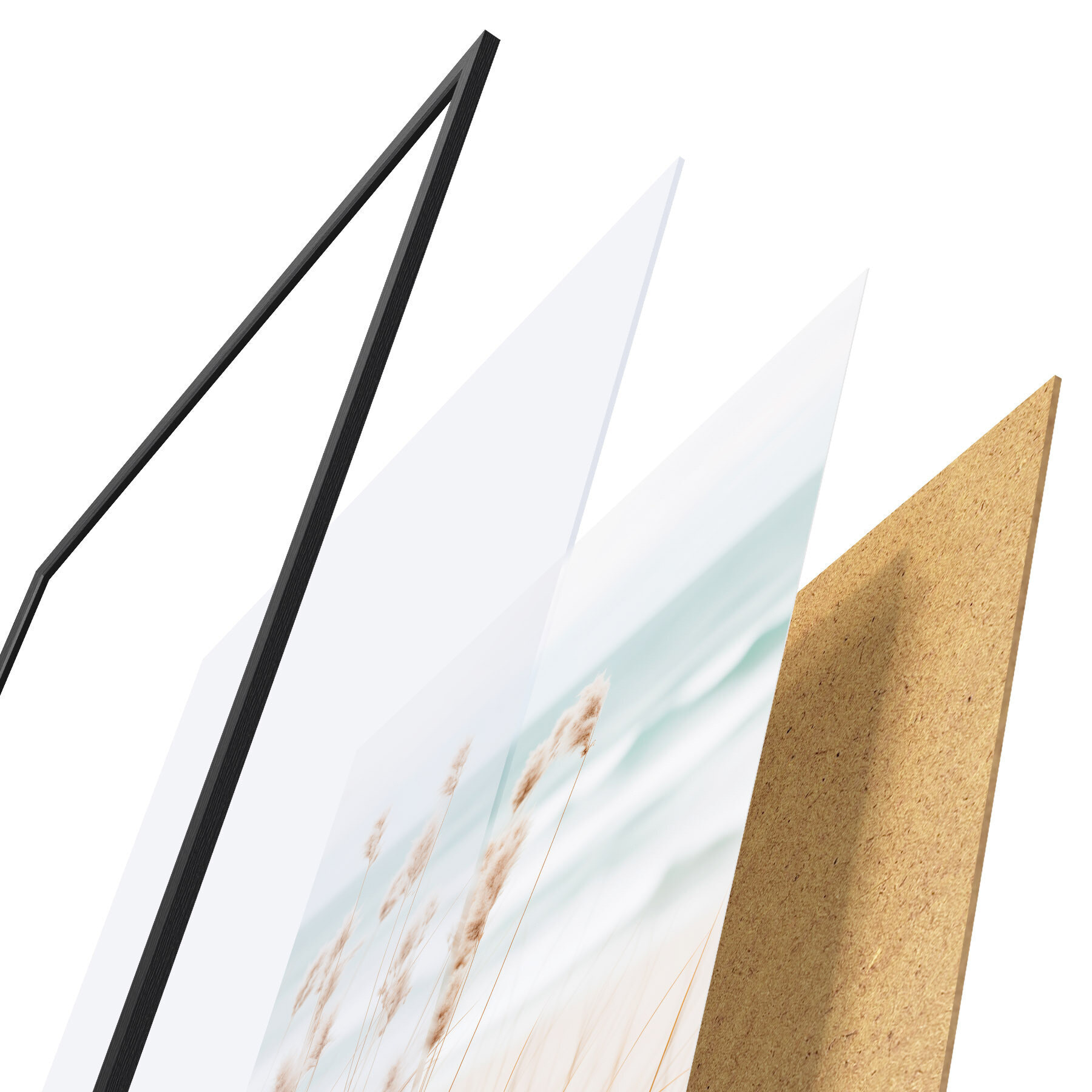El póster consta de marco, plexiglás, imagen impresa y soporte de aglomerado. El póster puede colgarse inmediatamente en la pared gracias a los soportes de la parte posterior.