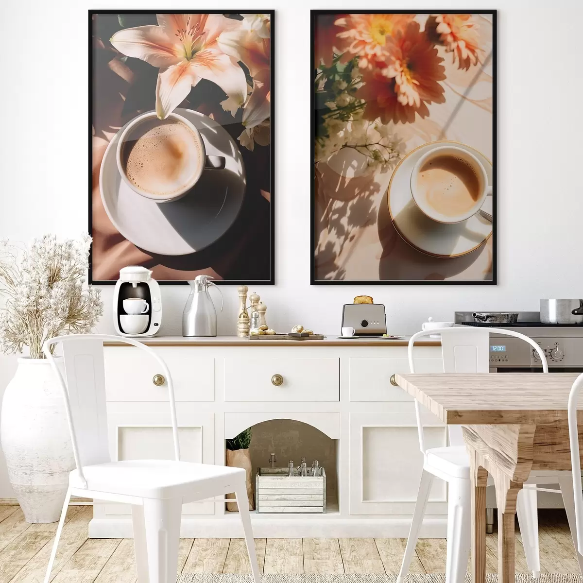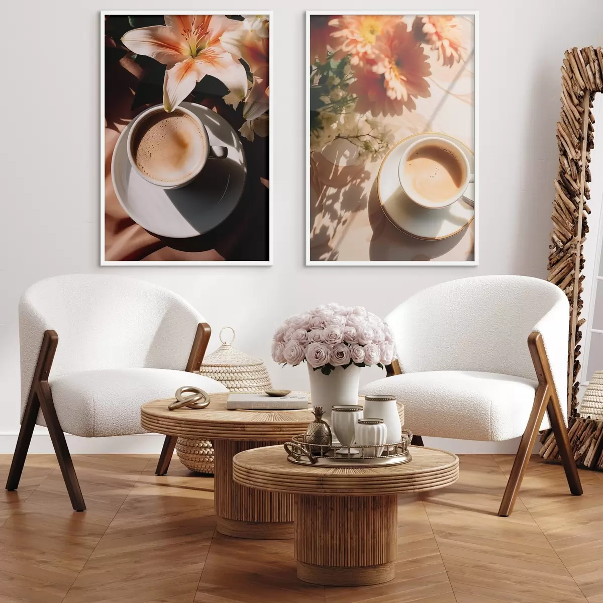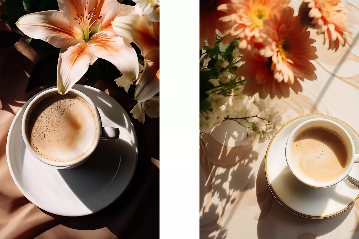 Poster Una taza de café con espuma en un plato blanco, unas flores al fondo, con luz solar Nr d00654