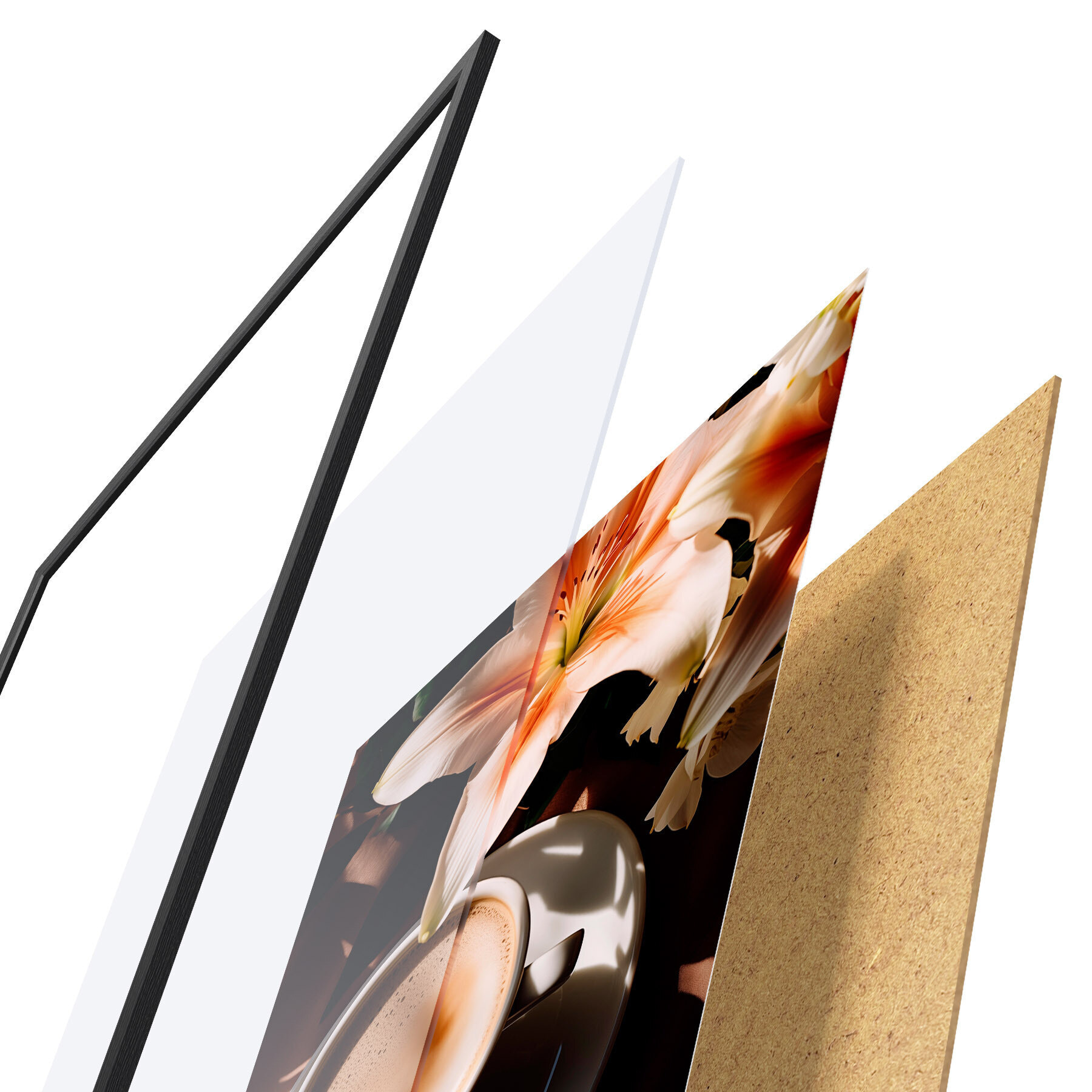 El póster consta de marco, plexiglás, imagen impresa y soporte de aglomerado. El póster puede colgarse inmediatamente en la pared gracias a los soportes de la parte posterior.
