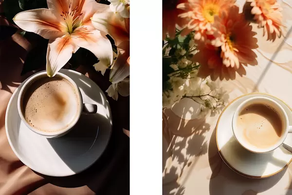 Poster Una taza de café con espuma en un plato blanco, unas flores al fondo, con luz solar d00654