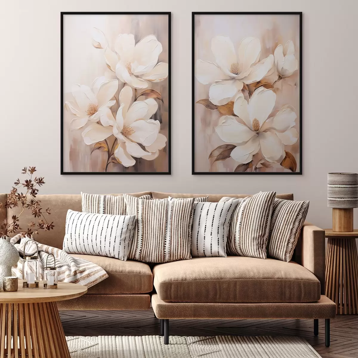Poster Flores blancas de magnolia sobre un fondo suave y difuminado de tonos beige y marrones, estilo pintura d00655