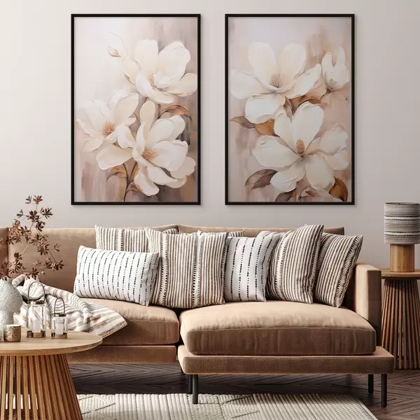 Poster Flores blancas de magnolia sobre un fondo suave y difuminado de tonos beige y marrones, estilo pintura Nr d00655