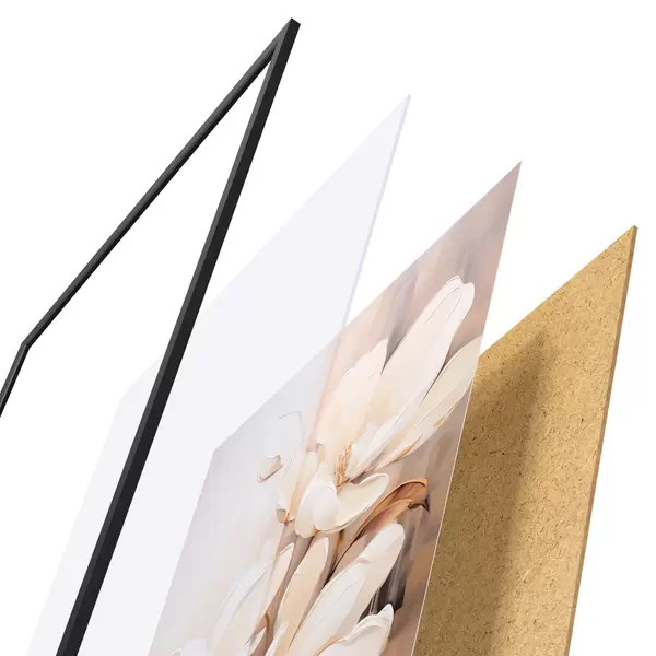 El póster consta de marco, plexiglás, imagen impresa y soporte de aglomerado. El póster puede colgarse inmediatamente en la pared gracias a los soportes de la parte posterior.