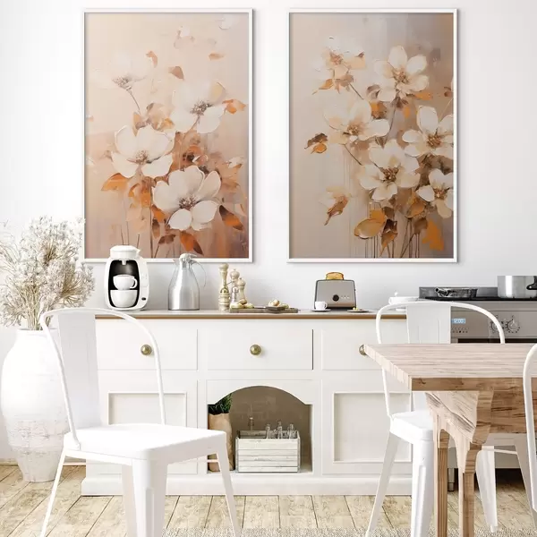 Poster Flores blancas con hojas naranjas, pinceladas delicadas, paleta de colores cálidos, composición elegante Nr d00656