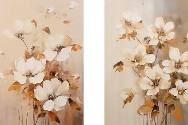 Poster Flores blancas con hojas naranjas, pinceladas delicadas, paleta de colores cálidos, composición elegante d00656