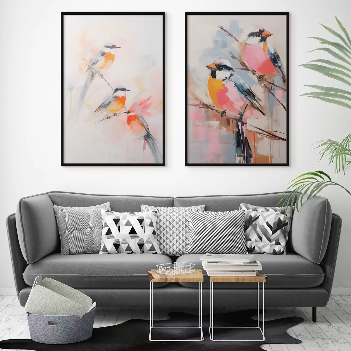 Poster Pájaros posados en ramas , suaves colores pastel, fondo claro con tonos rosas y blancos Nr d00658