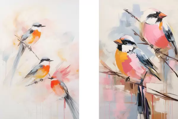 Poster Pájaros posados en ramas , suaves colores pastel, fondo claro con tonos rosas y blancos Nr d00658