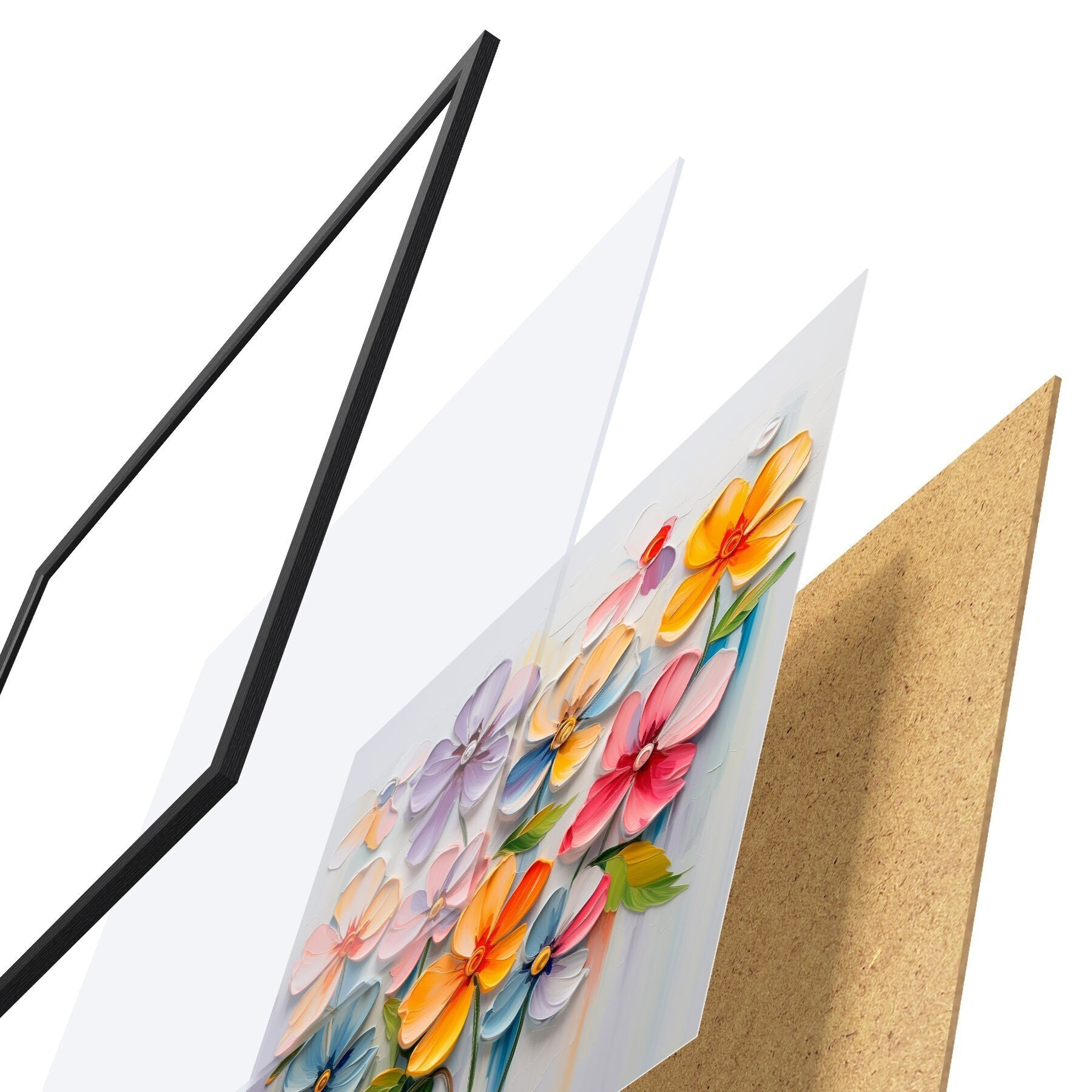 El póster consta de marco, plexiglás, imagen impresa y soporte de aglomerado. El póster puede colgarse inmediatamente en la pared gracias a los soportes de la parte posterior.