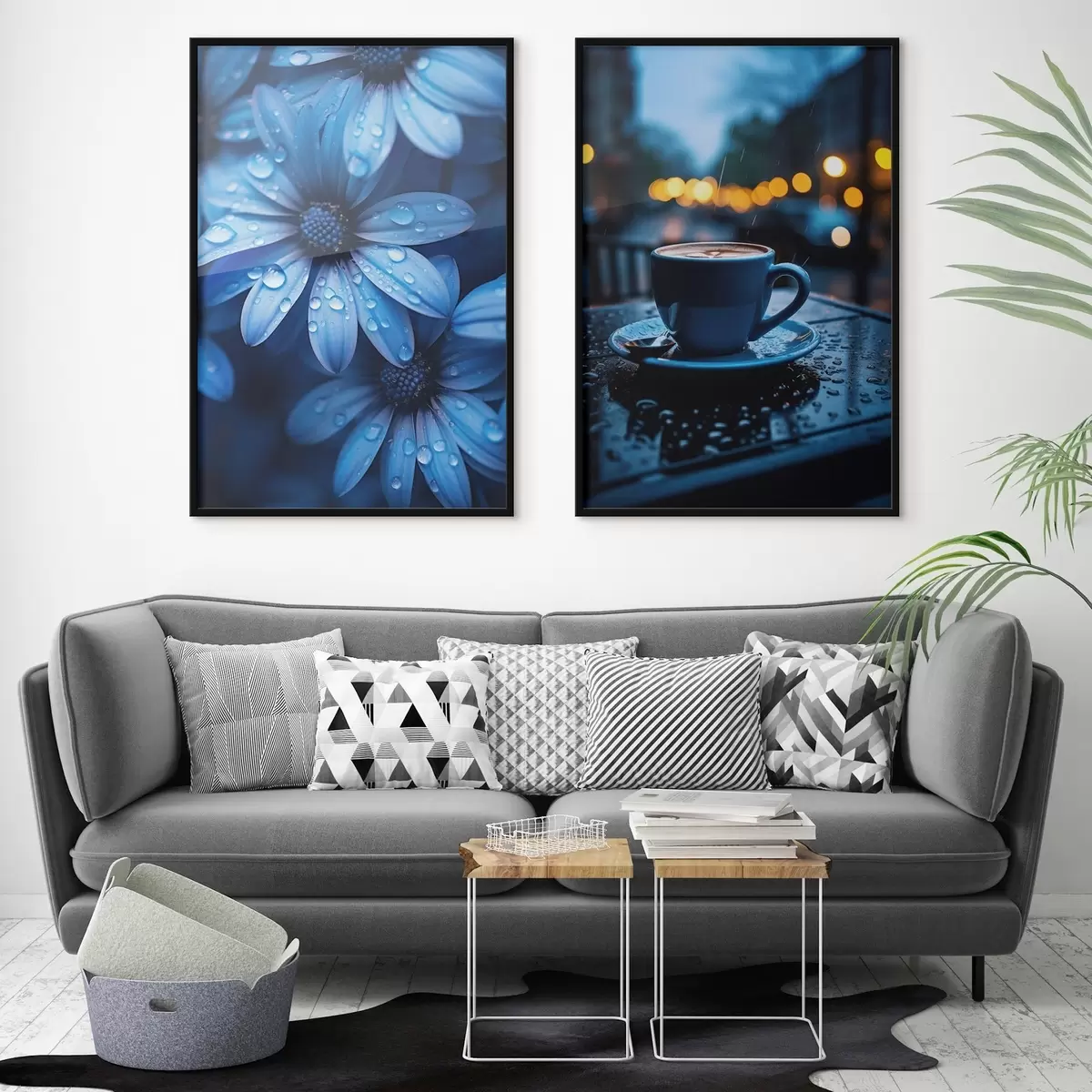 Poster Flores azules con gotas de agua y una taza de café bajo la lluvia d00694