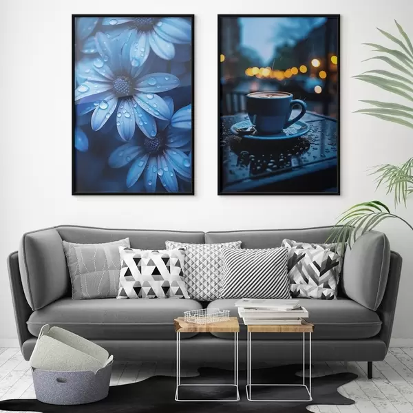 Poster Flores azules con gotas de agua y una taza de café bajo la lluvia Nr d00694