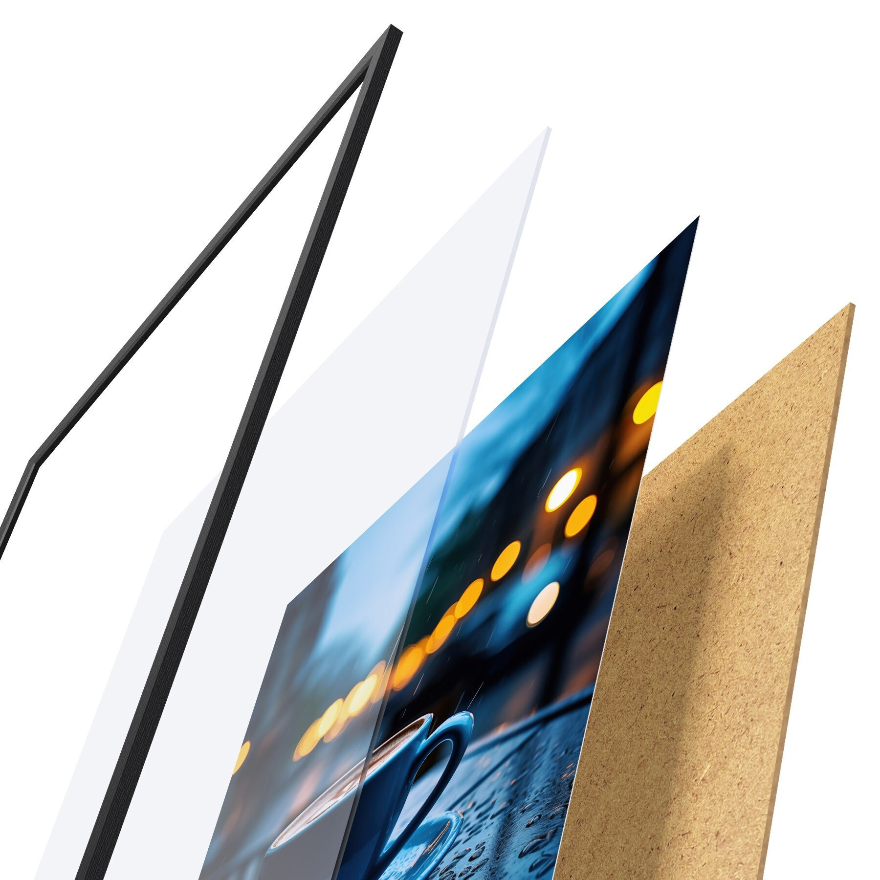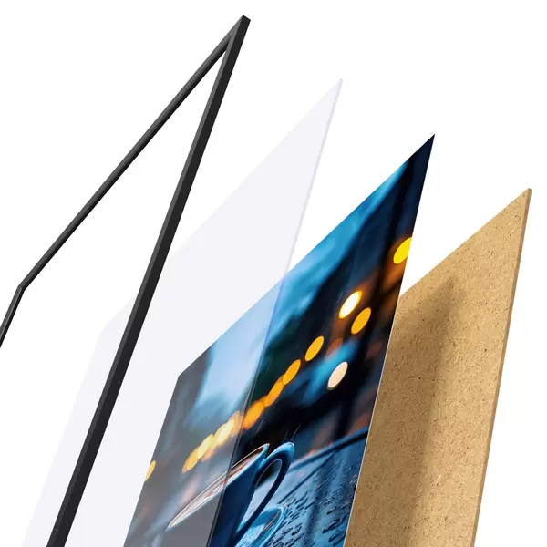 El póster consta de marco, plexiglás, imagen impresa y soporte de aglomerado. El póster puede colgarse inmediatamente en la pared gracias a los soportes de la parte posterior.