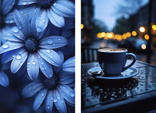 Poster Flores azules con gotas de agua y una taza de café bajo la lluvia Nr d00694
