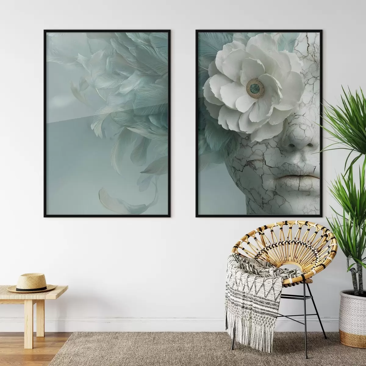Poster rostro de mármol de una niña con una flor y plumas d00699