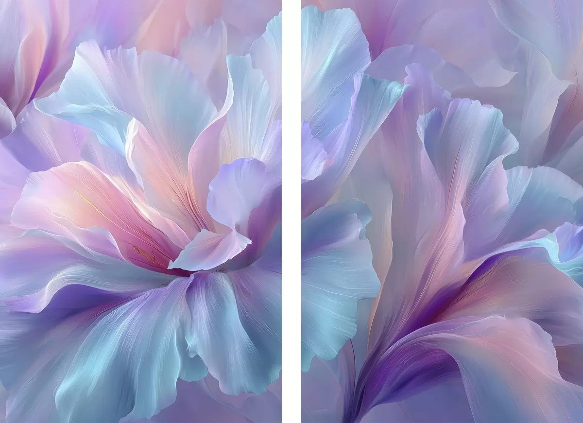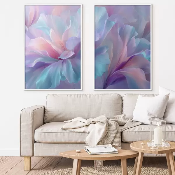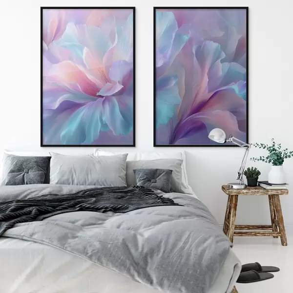 Poster Una delicada fantasía de flores con pétalos en tonos morados, azules y rosados. d00700