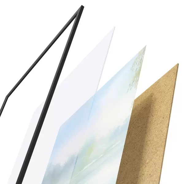 El póster consta de marco, plexiglás, imagen impresa y soporte de aglomerado. El póster puede colgarse inmediatamente en la pared gracias a los soportes de la parte posterior.