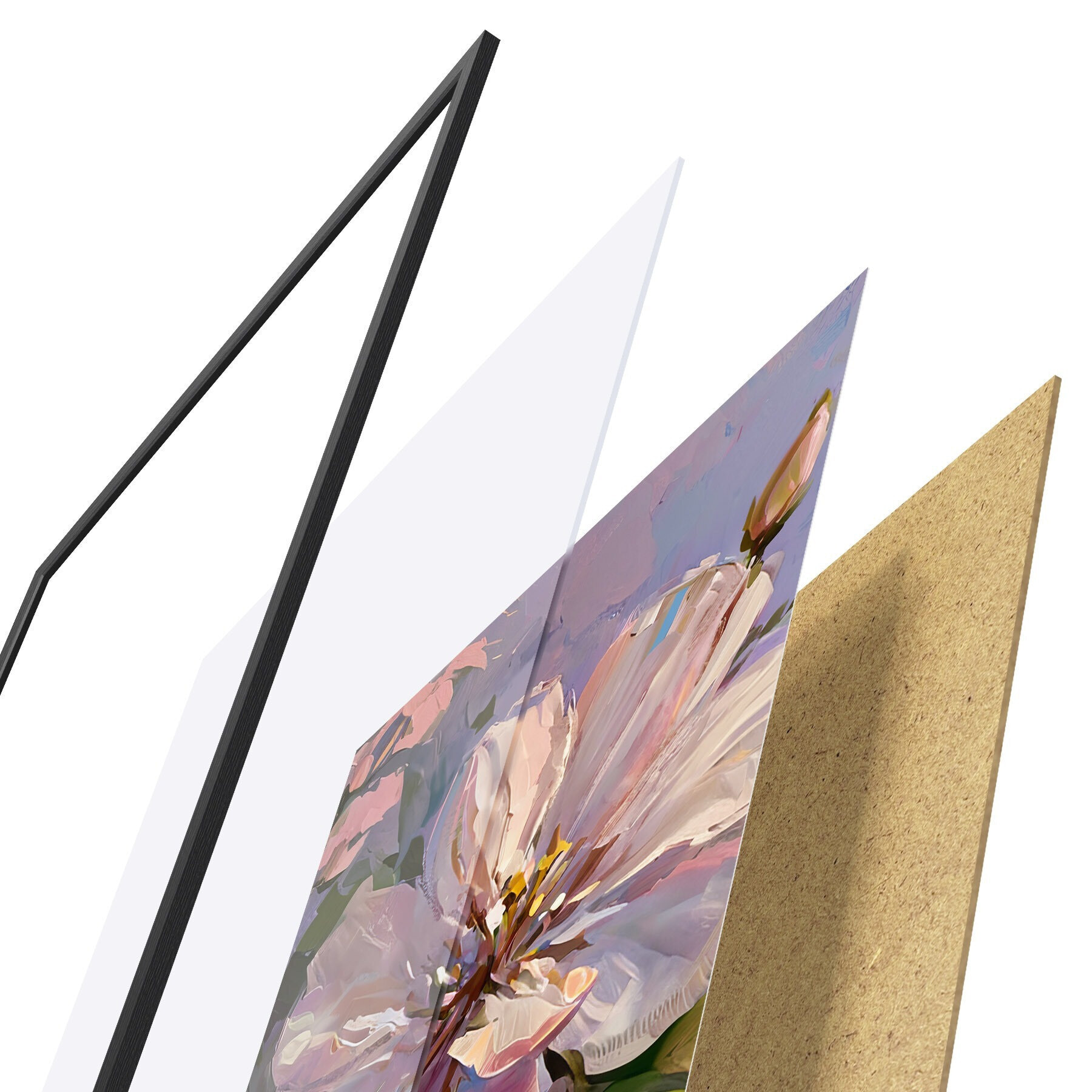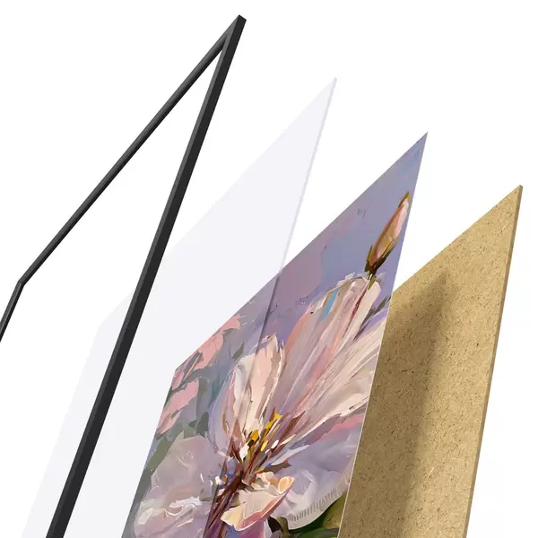 El póster consta de marco, plexiglás, imagen impresa y soporte de aglomerado. El póster puede colgarse inmediatamente en la pared gracias a los soportes de la parte posterior.