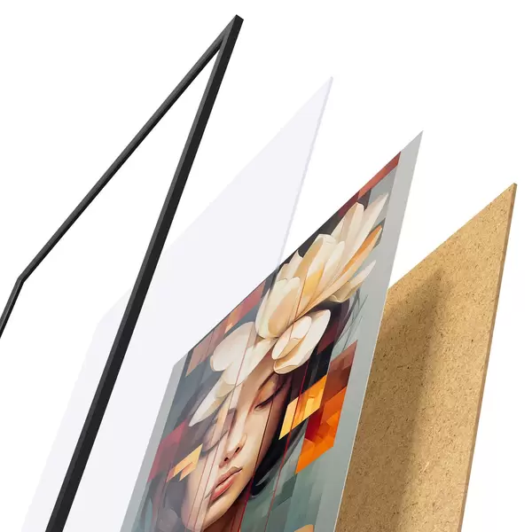 El póster consta de marco, plexiglás, imagen impresa y soporte de aglomerado. El póster puede colgarse inmediatamente en la pared gracias a los soportes de la parte posterior.