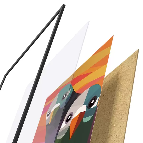 El póster consta de marco, plexiglás, imagen impresa y soporte de aglomerado. El póster puede colgarse inmediatamente en la pared gracias a los soportes de la parte posterior.