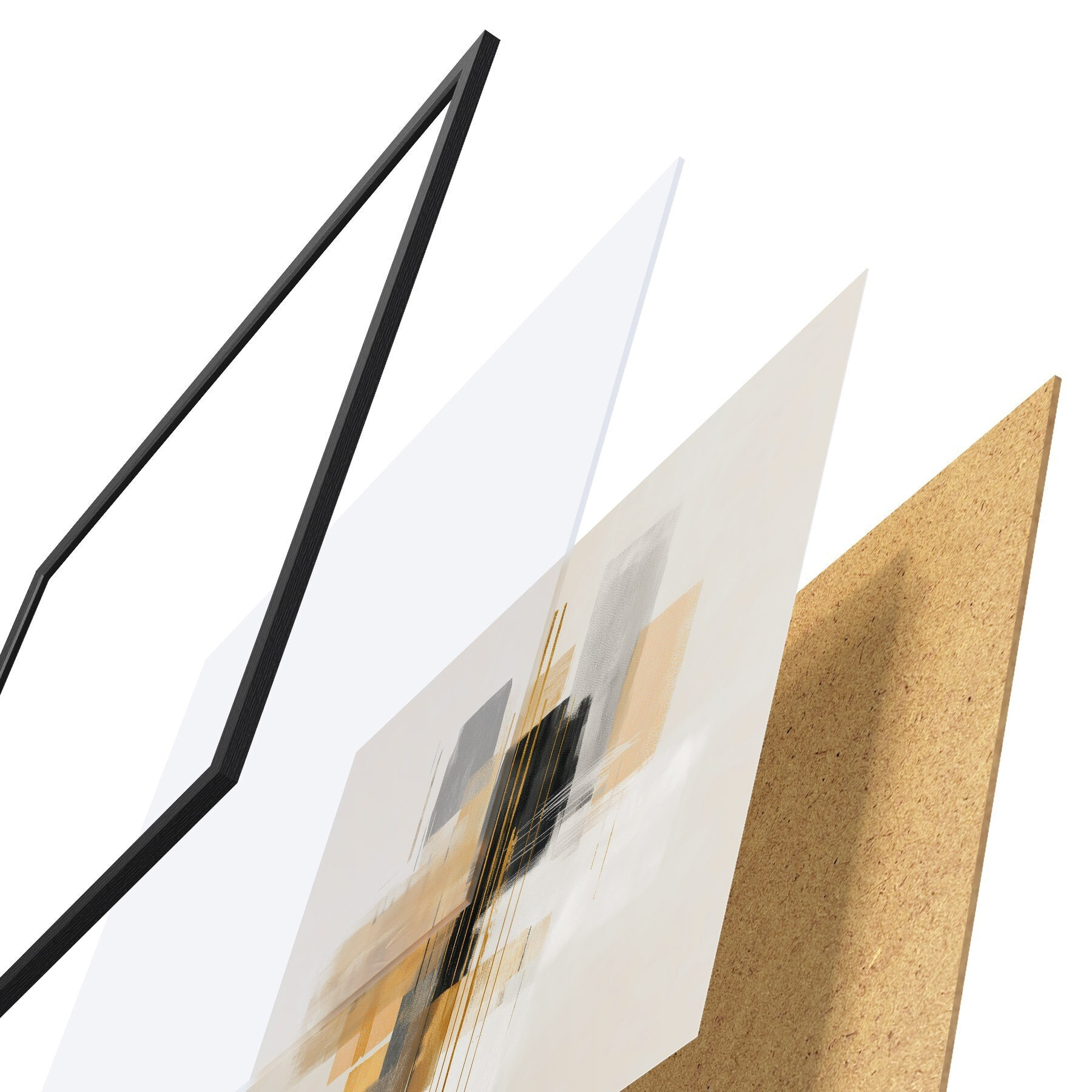 El póster consta de marco, plexiglás, imagen impresa y soporte de aglomerado. El póster puede colgarse inmediatamente en la pared gracias a los soportes de la parte posterior.