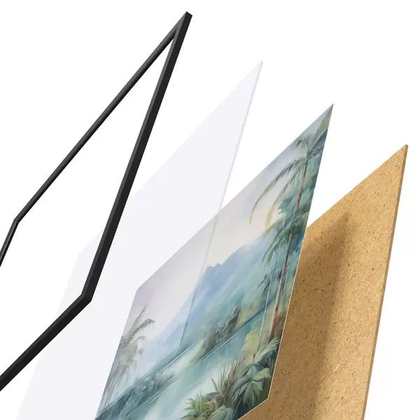 El póster consta de marco, plexiglás, imagen impresa y soporte de aglomerado. El póster puede colgarse inmediatamente en la pared gracias a los soportes de la parte posterior.