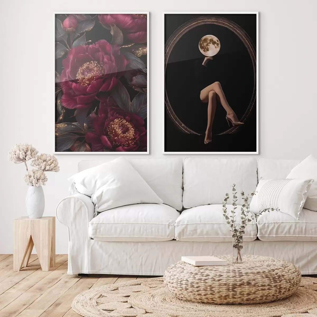 Poster Peonías de color burdeos y una silueta con cabeza de luna sobre fondo negro Nr d00765