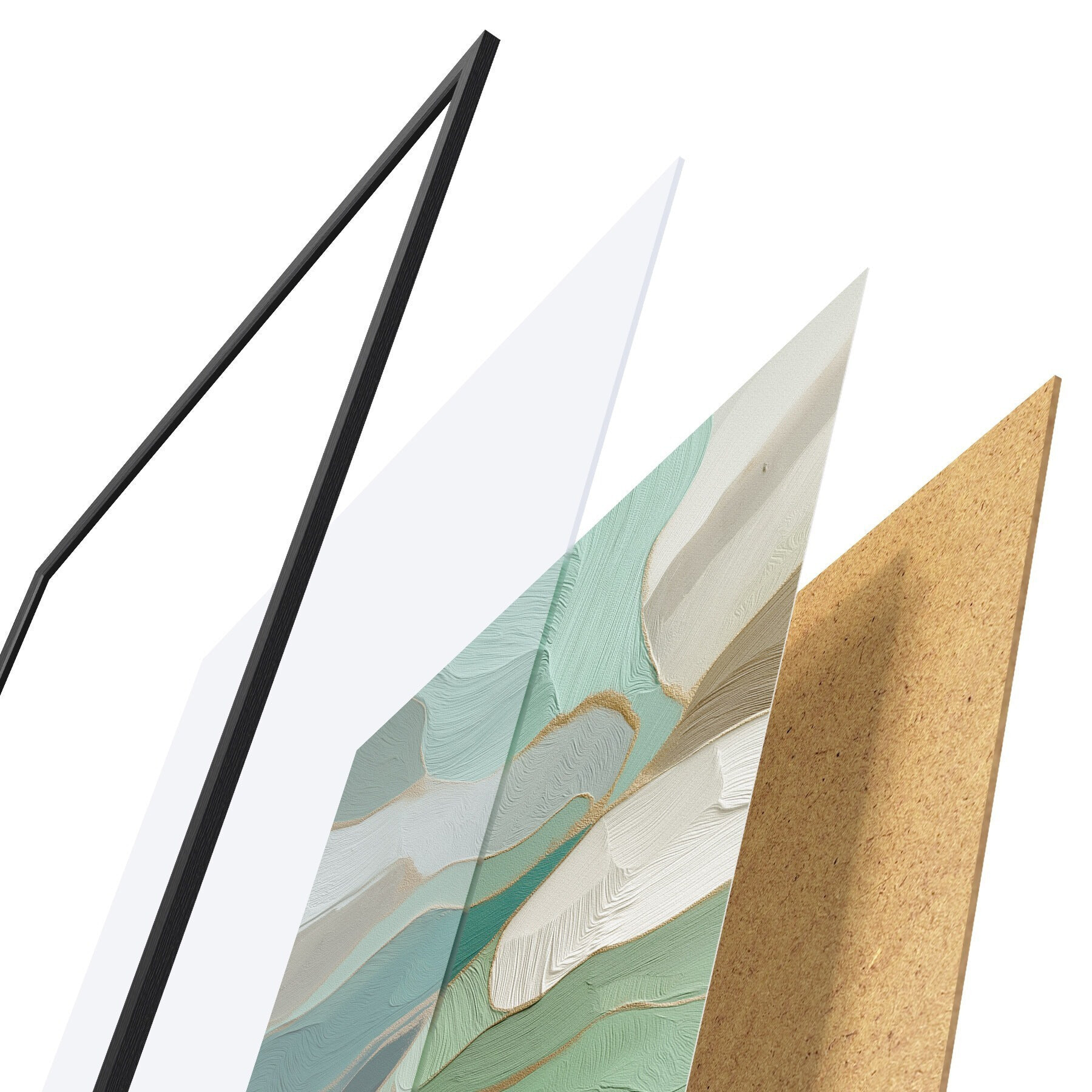 El póster consta de marco, plexiglás, imagen impresa y soporte de aglomerado. El póster puede colgarse inmediatamente en la pared gracias a los soportes de la parte posterior.