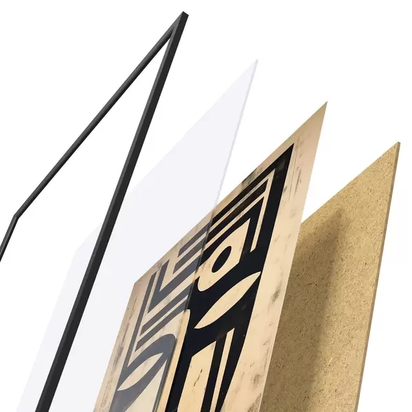 El póster consta de marco, plexiglás, imagen impresa y soporte de aglomerado. El póster puede colgarse inmediatamente en la pared gracias a los soportes de la parte posterior.