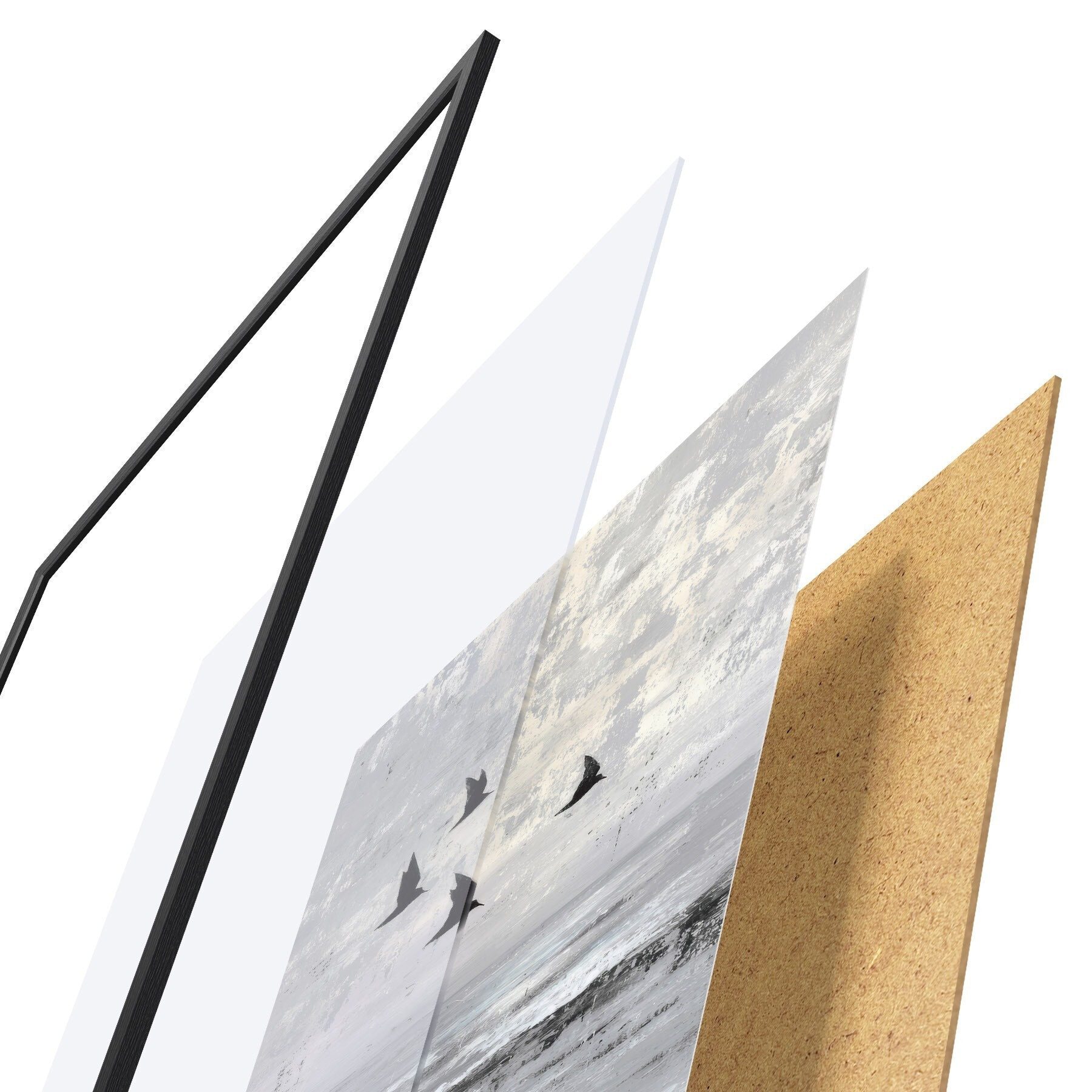 El póster consta de marco, plexiglás, imagen impresa y soporte de aglomerado. El póster puede colgarse inmediatamente en la pared gracias a los soportes de la parte posterior.
