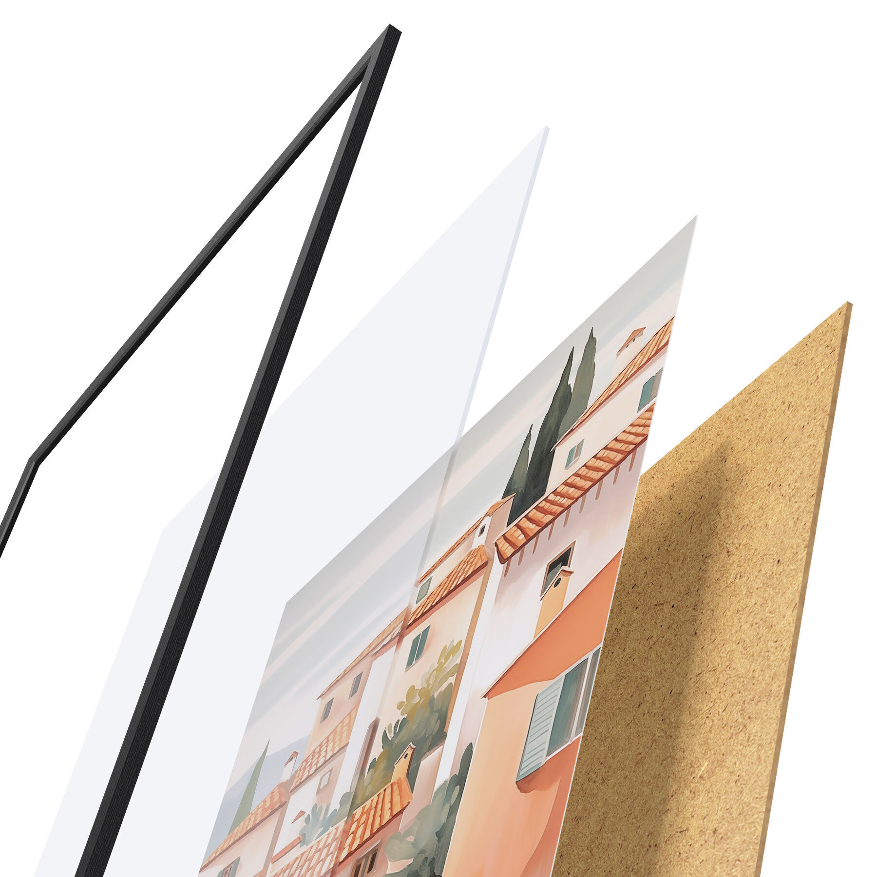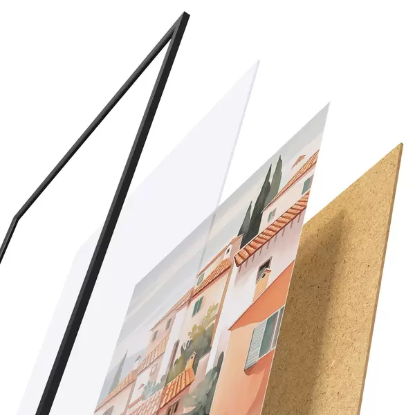 El póster consta de marco, plexiglás, imagen impresa y soporte de aglomerado. El póster puede colgarse inmediatamente en la pared gracias a los soportes de la parte posterior.