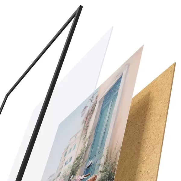 El póster consta de marco, plexiglás, imagen impresa y soporte de aglomerado. El póster puede colgarse inmediatamente en la pared gracias a los soportes de la parte posterior.