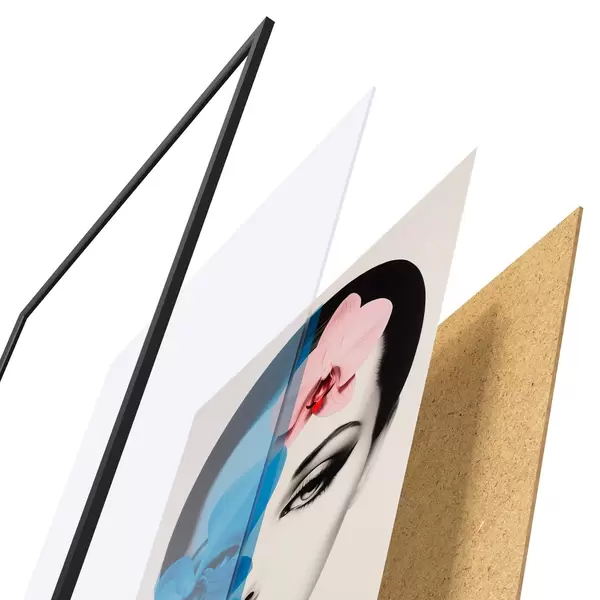 El póster consta de marco, plexiglás, imagen impresa y soporte de aglomerado. El póster puede colgarse inmediatamente en la pared gracias a los soportes de la parte posterior.