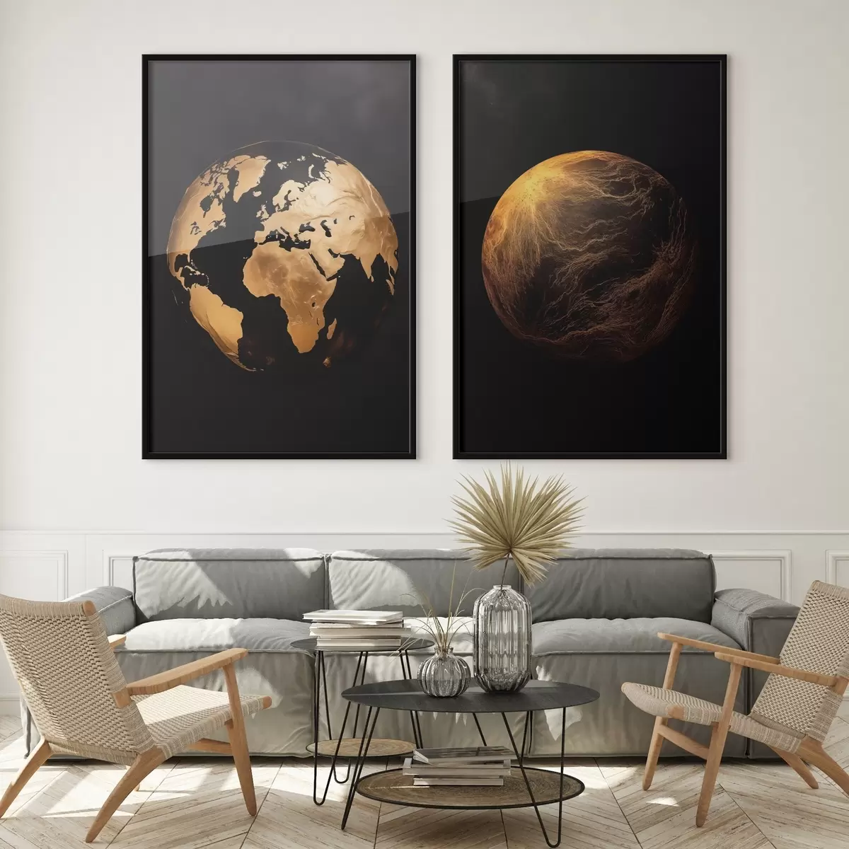 Poster Globo terráqueo y planeta abstractos con textura sobre fondo negro, arte minimalista moderno Nr d00827