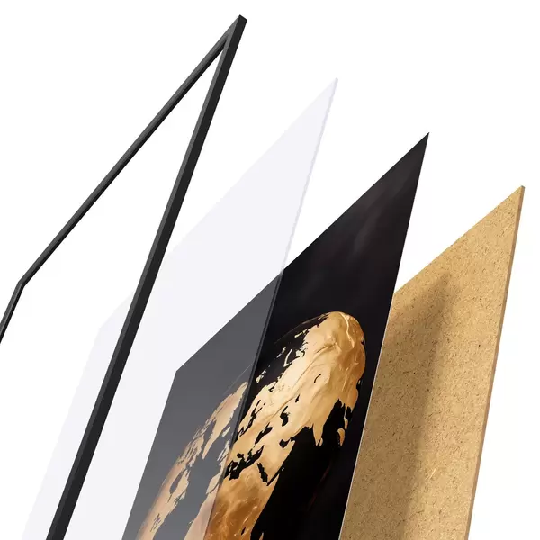 El póster consta de marco, plexiglás, imagen impresa y soporte de aglomerado. El póster puede colgarse inmediatamente en la pared gracias a los soportes de la parte posterior.