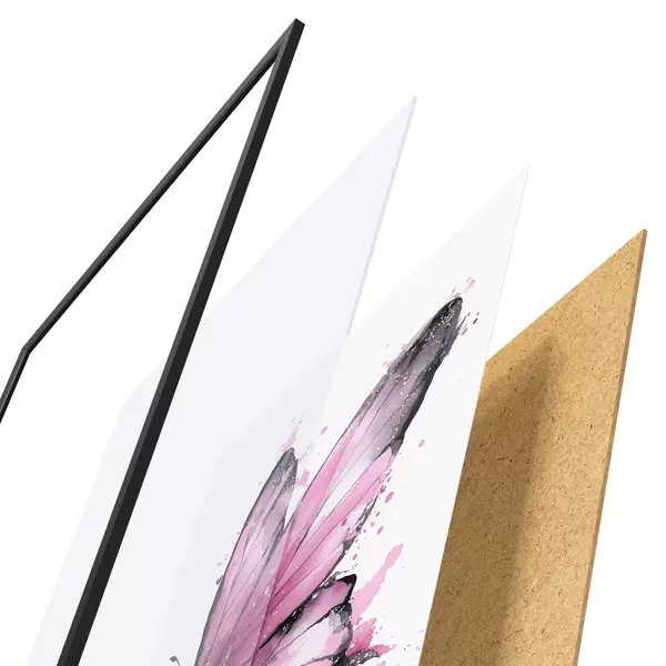 El póster consta de marco, plexiglás, imagen impresa y soporte de aglomerado. El póster puede colgarse inmediatamente en la pared gracias a los soportes de la parte posterior.