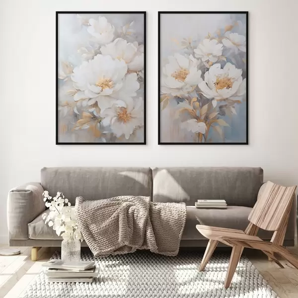 Poster Peonías blancas con centros y hojas amarillas, pinceladas suaves, fondo azul claro, arreglo floral Nr d00878