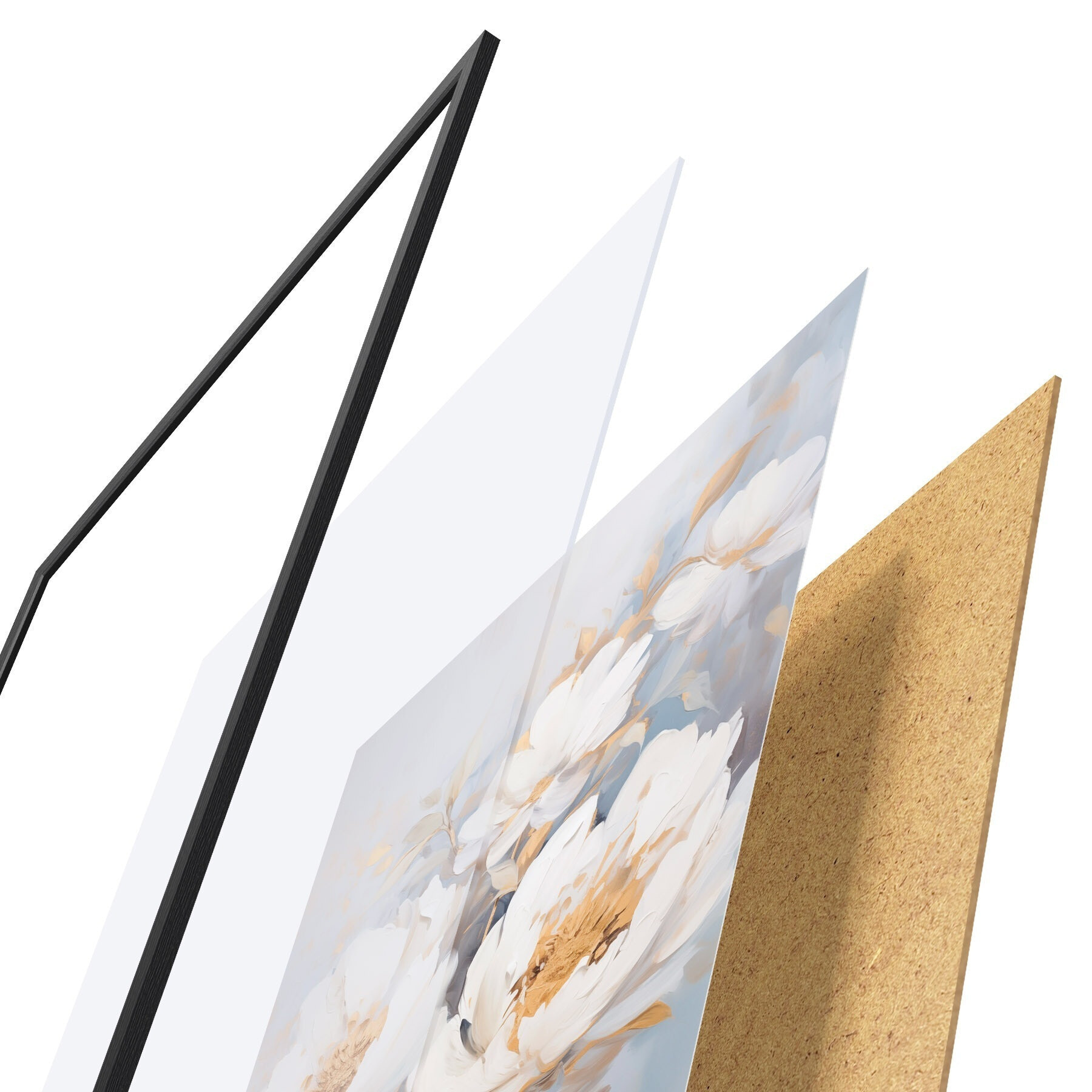 El póster consta de marco, plexiglás, imagen impresa y soporte de aglomerado. El póster puede colgarse inmediatamente en la pared gracias a los soportes de la parte posterior.