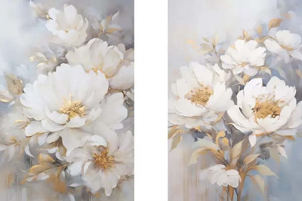 Poster Peonías blancas con centros y hojas amarillas, pinceladas suaves, fondo azul claro, arreglo floral Nr d00878