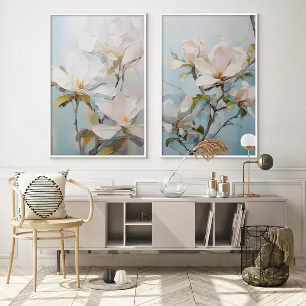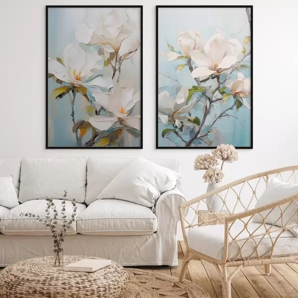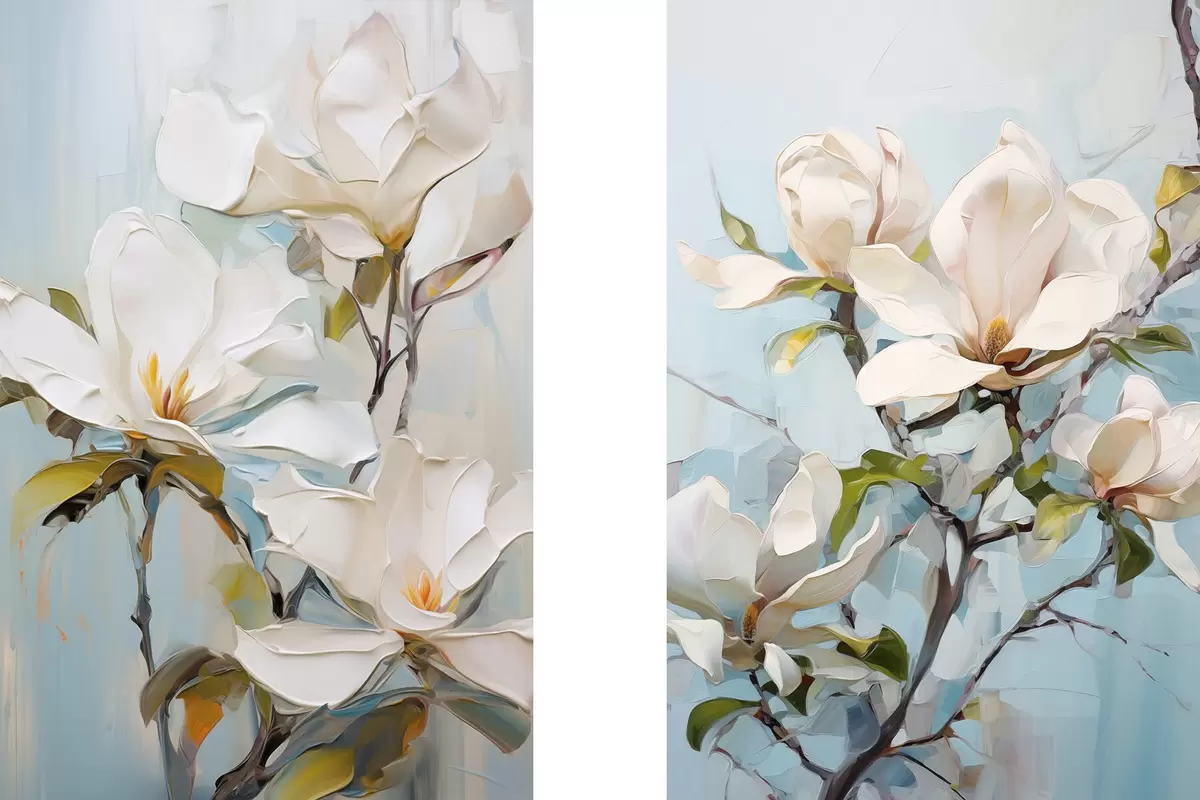 Poster Flores blancas de magnolia, fondo azul claro con suaves pinceladas, estilo pintura al óleo, textura impasto Nr d00881