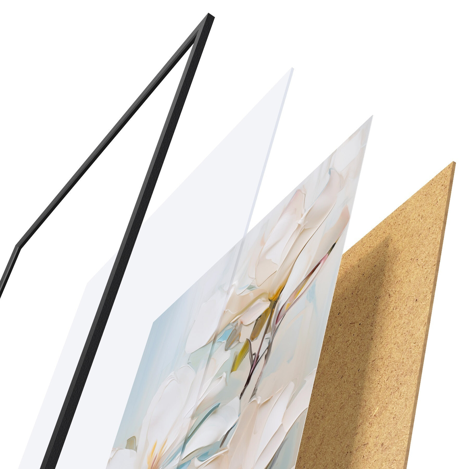 El póster consta de marco, plexiglás, imagen impresa y soporte de aglomerado. El póster puede colgarse inmediatamente en la pared gracias a los soportes de la parte posterior.