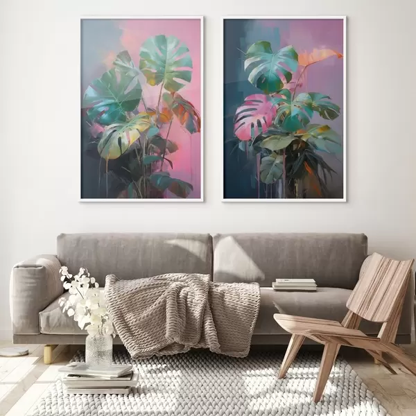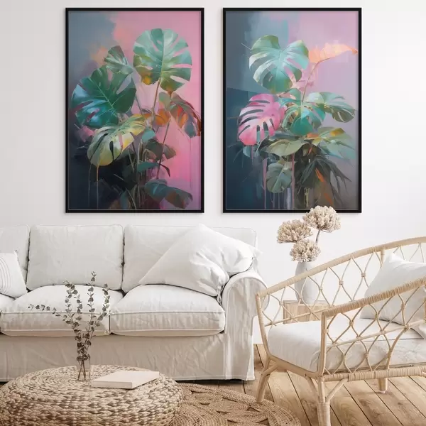 Poster Planta monstera abstracta con hojas de un verde intenso, sobre un fondo de suaves tonos rosados y morados. d00886