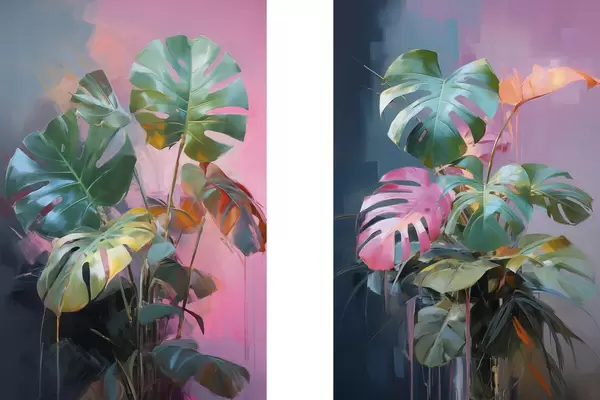 Poster Planta monstera abstracta con hojas de un verde intenso, sobre un fondo de suaves tonos rosados y morados. Nr d00886