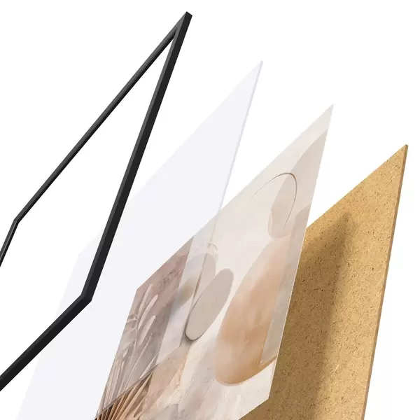 El póster consta de marco, plexiglás, imagen impresa y soporte de aglomerado. El póster puede colgarse inmediatamente en la pared gracias a los soportes de la parte posterior.