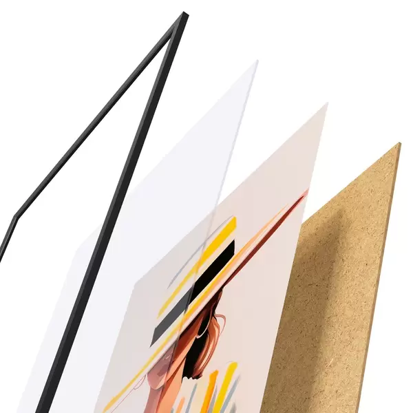 El póster consta de marco, plexiglás, imagen impresa y soporte de aglomerado. El póster puede colgarse inmediatamente en la pared gracias a los soportes de la parte posterior.